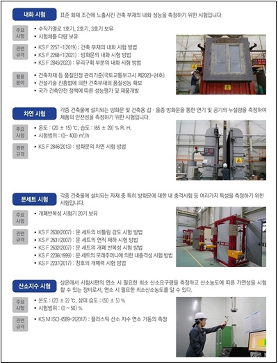 KOLAS 공인시험기관은 화재와 에너지·환경 분야를 아우르는 유리 및 창호 건축부재 성능시험 전문기관으로, 내화시험과 단열시험을 통합한 종합성능평가 시스템을 운영하고 있다.