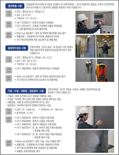 방화유리 내화시험과 복층유리 적용 창호의 열관류율 시험, 결로 및 기밀 성능 평가 등을 수행할 수 있는 점이 강점이다.